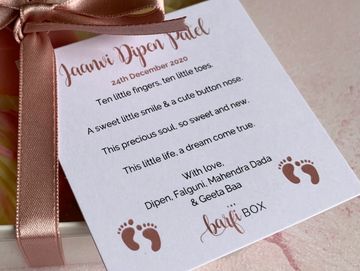 Personalisation can be added to all boxes, including Besan boxes. All Barfi boxes come with standard Rose ribbon colour.